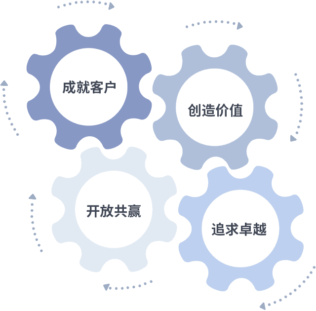 成就客户是一切决策的出发点,,创造价值是衡量所有工作的标准,,,追求卓越是我们做事做人的态度,,,开放共赢是我们的格局也是最终的结果。。。价值观的齿轮环环相扣,,推动着组织里的每个人不断向前。。。。
